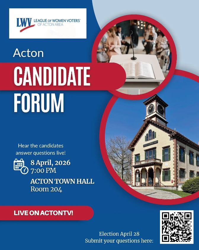 - Candidate forum with the League of Women Voters – Acton Area. This annual event is a chance to see and hear the candidates for contested races in a moderated forum. The forum is on Wednesday, April 8 at 7 p.m. in Acton Town Hall (Room 204). The forum will also be streamed live on Acton TV.